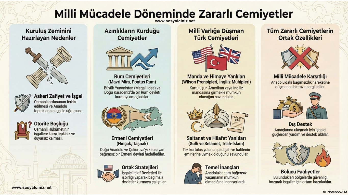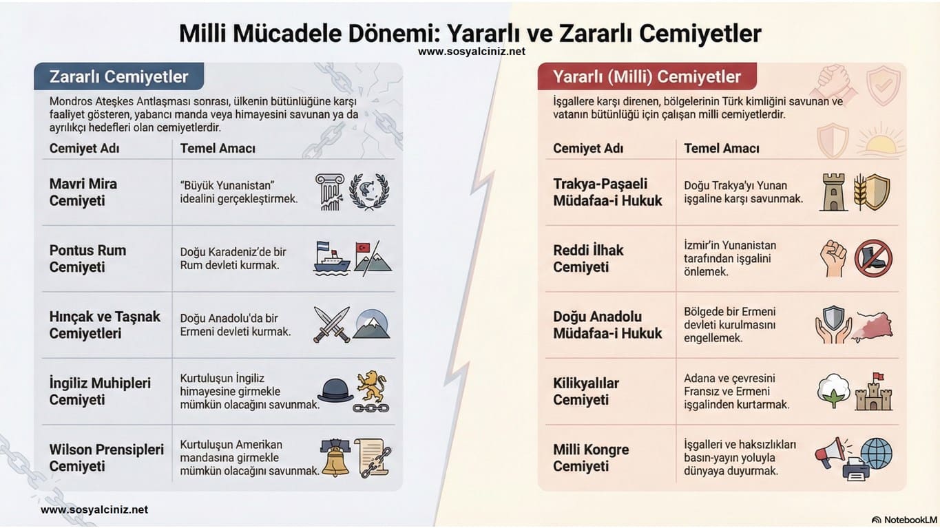 Milli mücadele sürecinde kurulan Zararlı Cemiyetler, Milli (Yararlı) Cemiyetler, Zararlı ve Yararlı Cemiyetler ile ilgili ingofrafik çalışmasıdır…